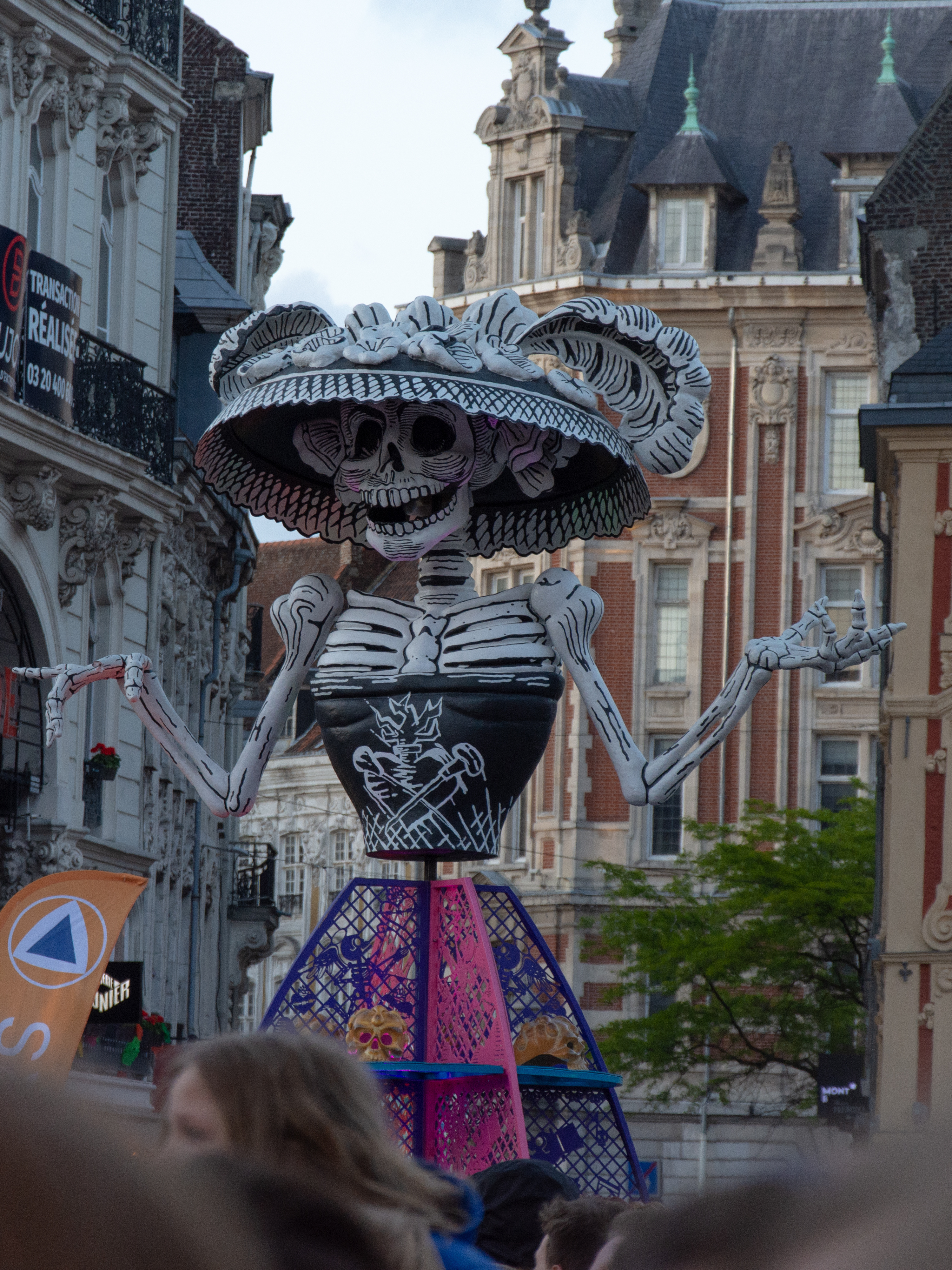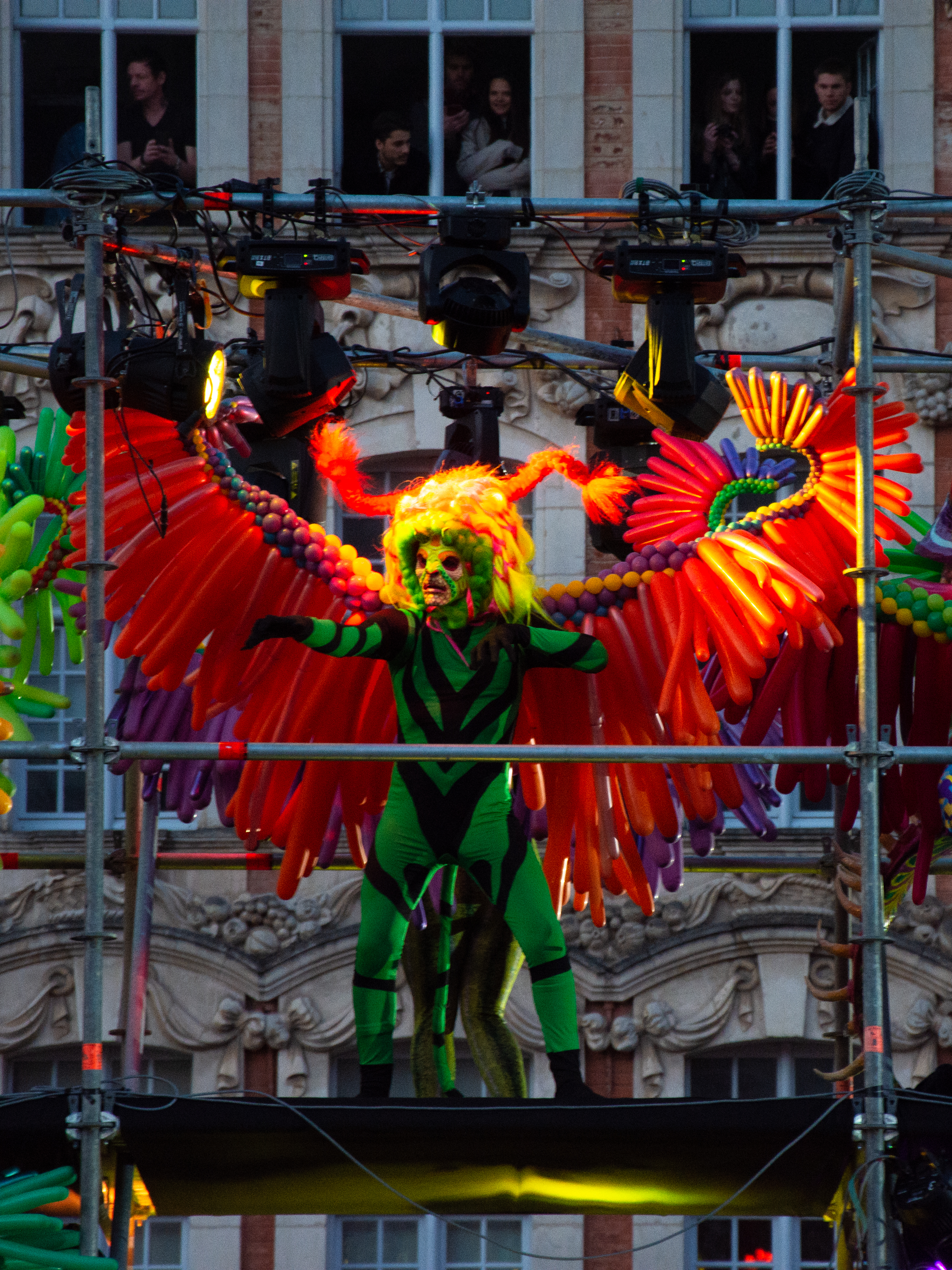 Rendez-vous 15 h au deuxième étage d’Euralille. Arrivée un peu en retard, c’était déjà une ambiance particulière, surtout dans le coin maquillage au fond de la salle : se dépêcher, il le faut, mais dans la bonne humeur. Dernière répétition générale à 16h : heureusement d’ailleurs, j’avais oublié certains des pas ! On a découvert les déguisements des personnes sur les chars au fur et à mesure, tous et toutes émerveillé.e.s devant leur beauté. J’avoue avoir une petite préférence pour celles et ceux de mon char : “el dia de los muertos”. Mais je dois bien avouer que les ailes faites de ballons des Alebrijes étaient impressionnantes ! A peine sortie de la salle pour se mettre en rang derrière les chars, les gens nous prenaient déjà en photo, tout sourire, heureux de voir la fête se préparer. Si je devais retenir un détail de cette parade, ce serait vraiment celui-là : les sourires des personnes devant lesquelles je passais. Lors des répétitions, j’avais réellement l’impression de devoir être au pas dans un défilé militaire. Là, j’ai retrouvé l’humanité : les gens dansaient avec nous, les enfants voulaient taper dans nos mains. Ce partage de joie et de bonne humeur m’a vraiment réchauffée quand le froid se faisait trop sentir ! L’harmonie qui jouait derrière nous mettait aussi une ambiance d’enfer – c’est le cas de le dire, on avait un diable aux trousses. Je pense que cette bonne ambiance avec les personnes hors de la parade était présente parce qu’elle était avant tout là entre nous, danseurs et danseuses bénévoles. Et se retrouver au Tripostal pour l’after avec nos « collègues » a continué de faire de cette soirée un doux moment hors du temps !
